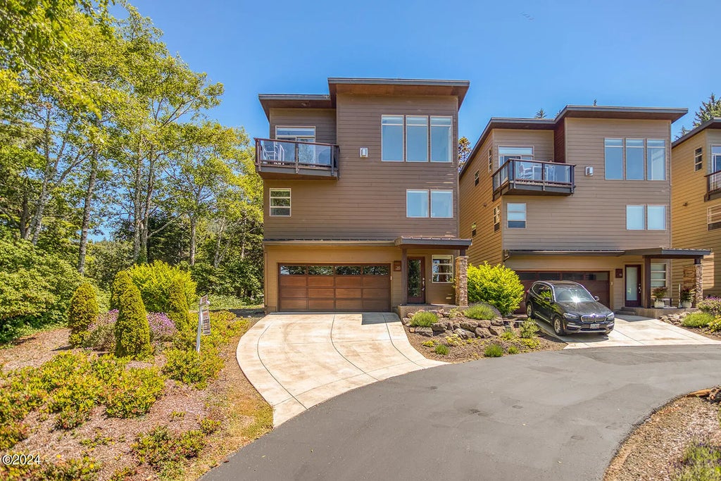 This stunning 3 bed, 3.5 bath contemporary home with elevator in the exclusive Koho community offers breathtaking ocean and bay views. This home offers both convenience and luxury and is a sought after northern end unit with prime privacy and views. With solid oak flooring, vaulted ceilings, and a stone fireplace, the living space exudes elegance. The chef's kitchen features an ocean views, gas cooktop, cherry cabinets and a pantry. Enjoy sunrise or sunset from the balcony with Trex deck and tempered glass wind protection. The primary suite includes an ocean view, walk-in closet, and luxurious bath with a deep soaking tub and travertine shower. The lower floor hosts a private guest suite and third bathroom with marble floors. Complete with a two-car garage with electric charging. Live maintenance free, tucked among the Pacific Ocean and the most pristine bay, within walking distance to all the shops, restaurants and galleries of Yachats. Koho Oregon HOA Fee of $366.00 Covers exterior maintenance of your home, landscaping, and use of clubhouse, fitness room, library/meeting space, billiards and garbage/recycling.