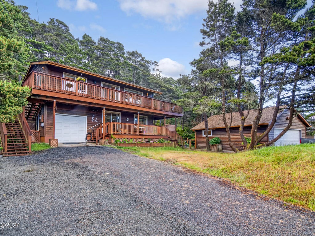 Tucked in the trees and just a couple blocks to the beach this well maintained 3 bedroom 2 bath home with ocean peeks has many upgrades including newer kitchen with hickory cabinets and granite counters, laminate floors, new deck. There is a family room on the lower level with a bedroom and bath providing an extended area for guests. The oversized double lot has generous and private outdoor space with an additional 2-car detached garage that has a finished guest /hobby room. Additional features include a newly built greenhouse for the gardening enthusiast. Just a couple blocks away, you'll find the Bayshore swimming pool, clubhouse, and convenient beach access to either the bay or the ocean. Don't miss the opportunity to own this beautifully updated home in an unbeatable location