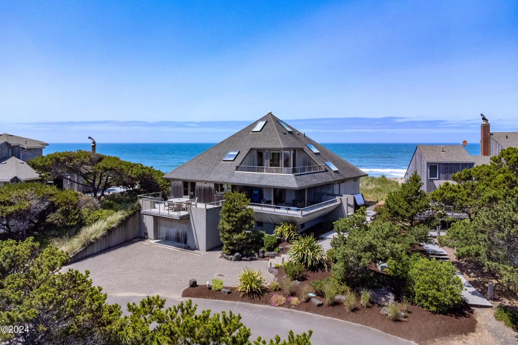 Ocean Spectacular beautifully remodeled blending superb Architecture with sweeping panoramic ocean & bay views from every window, deck and living space. A modern indoor / outdoor designed floor plan that features wonderful spaces for the whole family & guests. Unique pole staircase as focal point as you enter, lower family room w/ 2nd utility area for all your hobbies! Upper level has the crows nest w/ panoramic views for miles. You can relax year round on the oceanfront deck with large protective panels that slide open or close. Amenities include both patio & deck with hot tub & fire pit. The finest features and building products used in this home including appliances, cabinetry, carpeting, tile, & woodwork detail throughout.