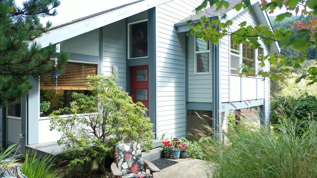 Beautiful contemporary home carries open concept theme throughout this exceptional split-level home. New hardwood oak floors, Southwestern style tiled floors in bedroom suite, kitchen, dining & surrounding lounge area. 2 bedrooms, 2 bathrooms + office/Den, Artist's studio, 2-car garage & tons of storage. Primary suite is open, jetted tub surrounded w/ colorful tile, shower, skylight, built-in cabinetry & walk-in closet. Retreat through sliding door to private covered patio. Tons of storage throughout. Great neighborhood, close amenities include swimming pool, hot tub, Tennis/Pickleball court, Kayak launch on Yachats River w/ trails. Close walk to sandy Yachats Bay to hunt sand dollars, agates and surf. Variety of village shops & restaurants. Small town living is calling to you. This home provides a spacious atmosphere inside and out. Beyond shade trees in yard enjoy expansive common area. Stunning mountain and forested views from kitchen, Den/office and side yards. Two patios to enjoy the outdoors are beautifully landscaped to offer privacy from street. Located in the peaceful community of Quiet Water in the ever popular village of Yachats.