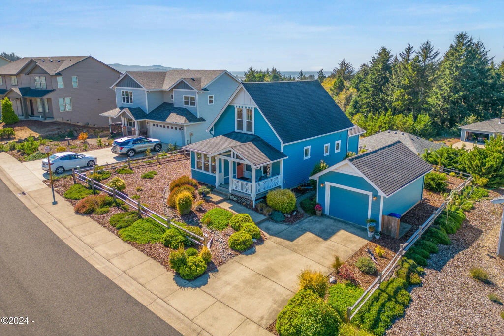 Fully appreciate the peaceful coastal life in this custom designed home with character and charm in the highly desirable Bayview Resort neighborhood. Perched on the hill, enjoying Ocean and Siletz Bay views. A covered front porch welcomes you inside to the tall ceilings, open floor plan living, dining and kitchen spaces. Kitchen featuring Stainless appliances, sizable island with seating & tile backsplash. Living room is highlighted by the cozy gas fireplace and built-in shelving featured throughout living spaces. Main level also includes a primary bedroom suite, sitting room w/ deck access, half bath and laundry room. Upstairs greets you with a staircase reading nook leading you to the 2 large bedrooms w/ walk-in closets, one with bay and ocean views, a full bath and bonus loft space... ...accessed by a ladder.