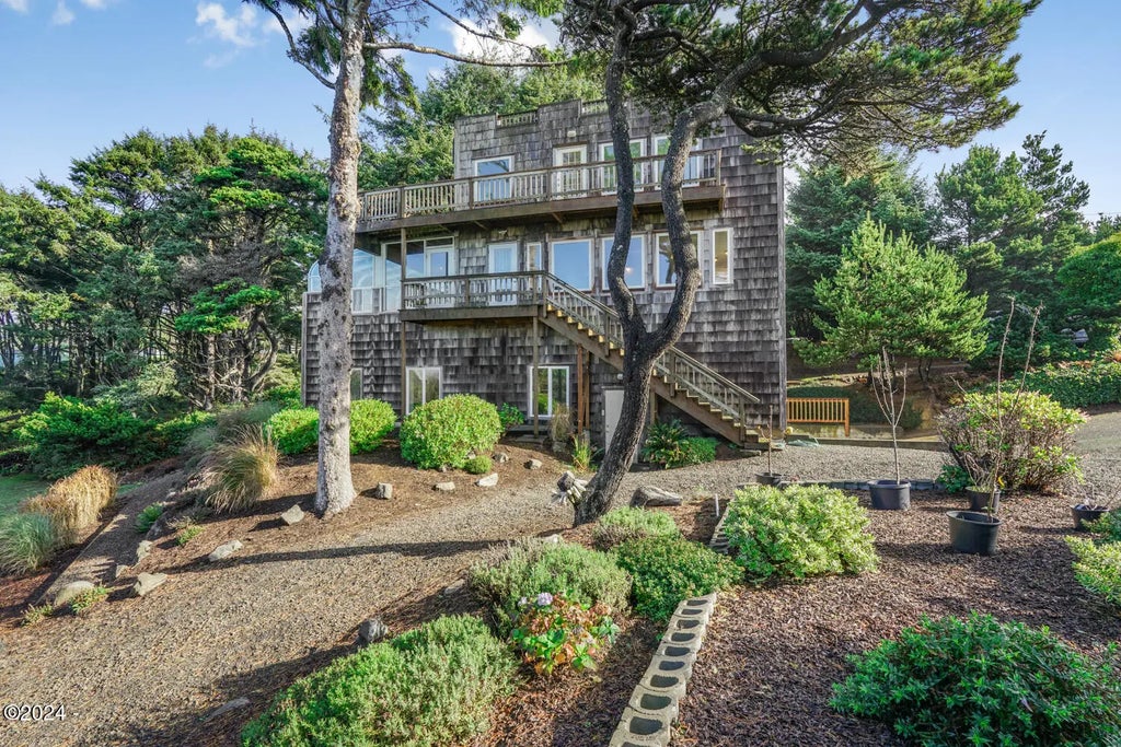Stunning home w/ views from every location! Direct trail access w/ way-side from driveway. Ocean & forest views from .55 acre corner lot. Open-concept main level w/ new Core-Tek laminate flooring & built-in stereo system wired throughout. Living room has wall of windows & flows into dining area w/ wood stove. Remodeled kitchen w/ brushed ss appliances, new countertops, pantry & eat-in bar. Main-level bedroom w/ custom built-ins & Murphy bed. Living & bedroom open to sunroom w/ amazing coastal views, tile-heated floors, electrical & plumbing connections. Primary suite w/ wood stove, private bath w/ jetted tub & deck. 2 more bedrooms & full bath. Oversized 4-car garage w/ tons of space for shop & includes hydroponic floor heating. Enjoy secluded beaches, tide pools, agate hunting.