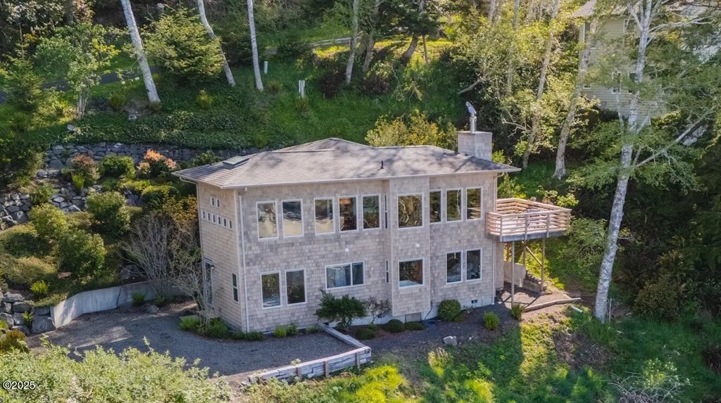 Discover one of Yachats' best-kept secrets: exceptional wind protection and plenty of all day sun on Horizon Hill's south-facing slope. This meticulously maintained 2BD/2.5BA architecturally designed home boasts expansive ocean and river views that you'll be proud to showcase. The designer kitchen features soapstone counters, gas range with steam option, touch less faucet, and Bosch dishwasher. Enjoy the cozy fireplace, solid bamboo flooring, and commercial-grade carpeting. Both bedrooms offer ensuite baths. Unobstructed views from nearly every room in the house and all tucked into the hillside with stunning landscaping. Sold completely furnished with high-end appointments, this turnkey property has a large lot below in order to preserve all the ocean, river and mountain views.