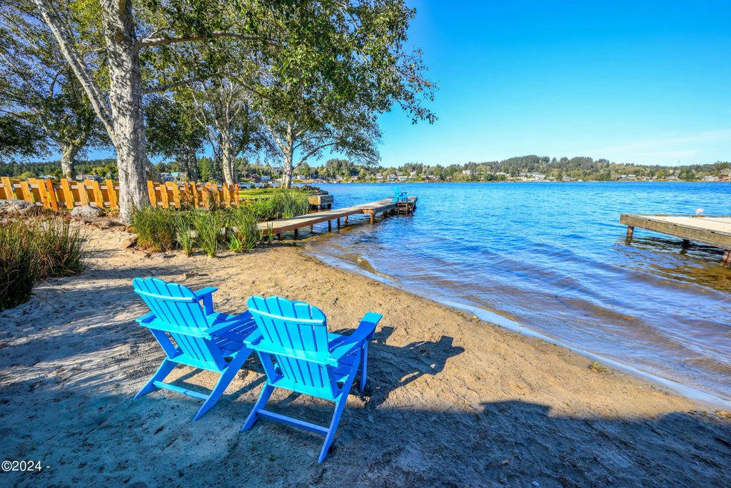 Discover Serenity: Custom Lake Home with Private Beach. Escape to your private lakefront paradise! This custom-built 2007 retreat, offered fully furnished and in excellent condition, boasts 2,164 sq ft of pure serenity. Discover breathtaking 360-degree lake views from this architecturally designed home, perfect for enjoying wildlife and stunning sunsets. The sleek, modern kitchen features brand new stainless steel appliances, while the open-concept dining and living area, complete with a wet bar, beverage fridge, and gas fireplace, is ideal for entertaining. Step out onto 830 sq ft of TimberTech decking, offering sheltered sunny spots, a gas barbecue, and a fire pit - your perfect outdoor oasis. The primary suite enjoys direct deck access, while the sunny guest bedroom provides stunning lake views. The garden level offers a versatile family room, utility room, a bunk room, an additional full bath, and an expansive 896 sq ft garage with extra high ceilings and doors, perfect for boat storage - ample space for all your lake toys! Beyond the home, a large backyard provides ample space for lawn games and family fun. Your personal sandy beach, with its gentle lake bottom extending beyond the dock, invites endless aquatic fun. The dock, complete with a swim ladder, provides effortless access for water activities and boating. Situated on the desirable, secluded Loop Drive with friendly neighbors, this unbeatable location next to Sand Point Park is just minutes from ocean beaches and city amenities. Ready to move in and start making memories!