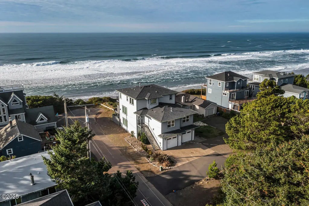 Luxury coastal living with panoramic ocean views from nearly every room in this 4BD/4.5BA, 3,938 sq ft custom home built in 2021. The upper-level primary suite features a private balcony, gas fireplace, spa bath, sauna, and roll-in shower. Two main-level en suites and one on the lower level offer flexible living. Great room with high ceilings, gas fireplace, and wall of windows flows to a view deck. Gourmet kitchen with quartz countertops, island, gas range, and stainless appliances. Lower level includes family room with kitchenette and full bath.