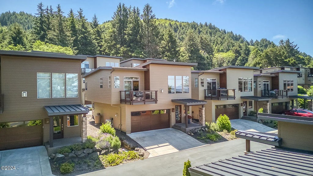 Welcome to this nearly-new contemporary home in the exclusive gated KOHO community, offering breathtaking simultaneous views of the ocean, bay, and Yachats River. Just steps from beach access, this open-concept home features vaulted ceilings, large windows that flood the space with natural light, and elegant oak hardwood floors. The kitchen is equipped with upgraded Bosch appliances, and a cozy stone fireplace with a gas insert warms the living space. Stay comfortable year-round with a ductless heat pump for heating and cooling. Ocean, river and Bay view balcony with trex decking. The two-car garage with storage and heat. The HOA covers exterior maintenance, landscaping, and grants access to top-tier amenities, including a clubhouse, exercise room, and billiard room More About Yachats & the KOHO Lifestyle: