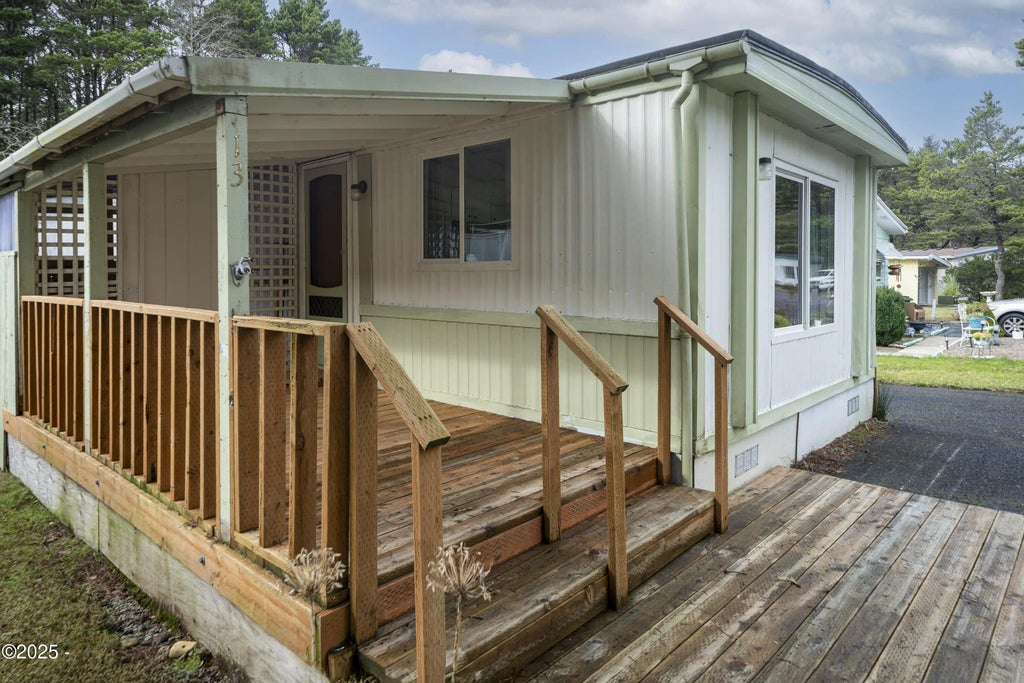 This charming manufactured home in Driftwood Village, a highly sought-after 55+ community just steps from Driftwood State Park. This single-level home features an open floor plan with light cabinets and stunning dark vinyl flooring, creating a bright and welcoming living space. The long driveway provides ample parking, while the exterior includes a convenient shed and a small greenhouse. The current space rent, includes some utilities, RV storage, and access to fantastic amenities such as a clubhouse. Enjoy the peaceful coastal lifestyle with the perfect blend of convenience, comfort, and charm in this prime location. Ideal for those looking for low maintenance living in a vibrant, active community near the ocean. Don't miss this opportunity to make this home yours!