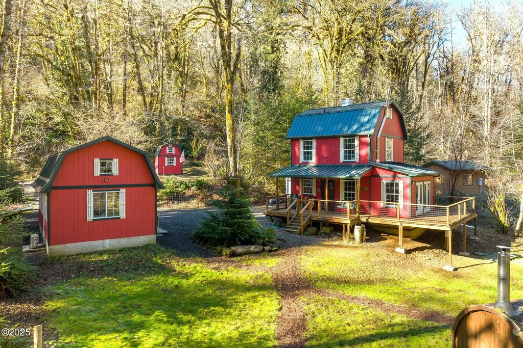 Find peace and tranquility on the Alsea River in this artistically crafted cottage resting in a magical natural wonderland in the heart of Oregon's coastal mountain range. The Alsea River is renowned for its Salmon, Steelhead, and Trout fishing. It doesn't get much easier to go fishing than this. Intelligently designed details are shown throughout the property and home, from the gated entrance and a metal roof to stairs down to the river for easier access. The interior features artistic finishes, high ceilings, gorgeous wood floors throughout, except for the beautiful porcelain tile in the bathroom, and plenty of storage options in the attic and under the stairs. Elegant marble countertops, a gas range with a pot filler, stainless steel appliances, and soft-close cabinets highlight the kitchen. A new wood stove and double French doors opening to an exterior deck create a picturesque coastal mountain feel to this home. The upstairs is a bedroom ensuite to itself with a sitting area and a walk-in shower. This great design continues to a newly built garage/studio with double doors, a full bathroom, a loft, a ceiling fan, and a mini-split. A new 20kw backup generator can power the house and garage/studio. Shipping container with electricity provides additional storage and could be a great workshop. There is a recently tapped spring with a cistern that provides landscaping water.