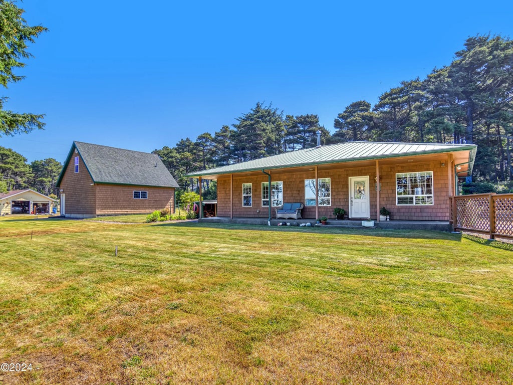 Two separate parcels included for the price of one. This meticulously maintained single-level ocean view home features 2 bedrooms, each with its own on-suite full bath, and an additional half bath. You'll love the well designed kitchen with plenty of wood cabinets and counter top work space. Relax on the charming covered porch, perfect for enjoying the stunning ocean views and refreshing sea breeze. Set on a private .55-acre double lot for ample space and privacy, this property has a detached single car garage along with a separate large workshop/2 car garage. The shop building has a finished upstairs area and full bath, perfect for guests or your hobbies. RV hookups on the property. Upgraded Green Construction features include, 2x6 studs & 20R wall insulation, 30R ceiling insulation.