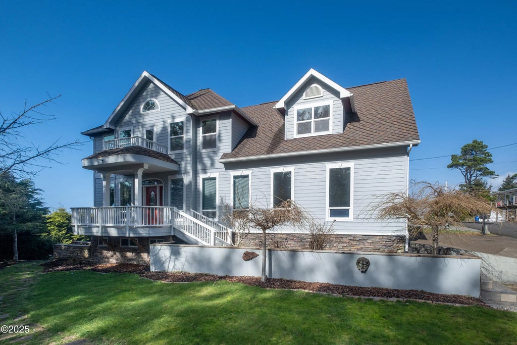 Rare Victorian home with awesome ocean views and room for everyone. Main floor features an ornate entry door into the foyer w/French doors to a west facing study & formal dining room across the entry hall, the open kitchen, ocean view living room and 1/2 bath off the garage entrance. The 2nd floor features a NW corner primary bedroom suite w/private deck and the SW Corner bedroom, both w/large picture windows to maximize the view. 2 more bedrooms, bath, office, laundry rm w/south views of the Pickleball courts complete this level. A finished attic makes the perfect ocean view art studio, study, etc. Poss. dual family living in the finished daylight bsmt w/sep. entrance, kitchenette, laundry, 5th bdrm + office & fam. rm w/slider to private backyard w/built-in fire pit & dog run. Home includes central vacuum system.