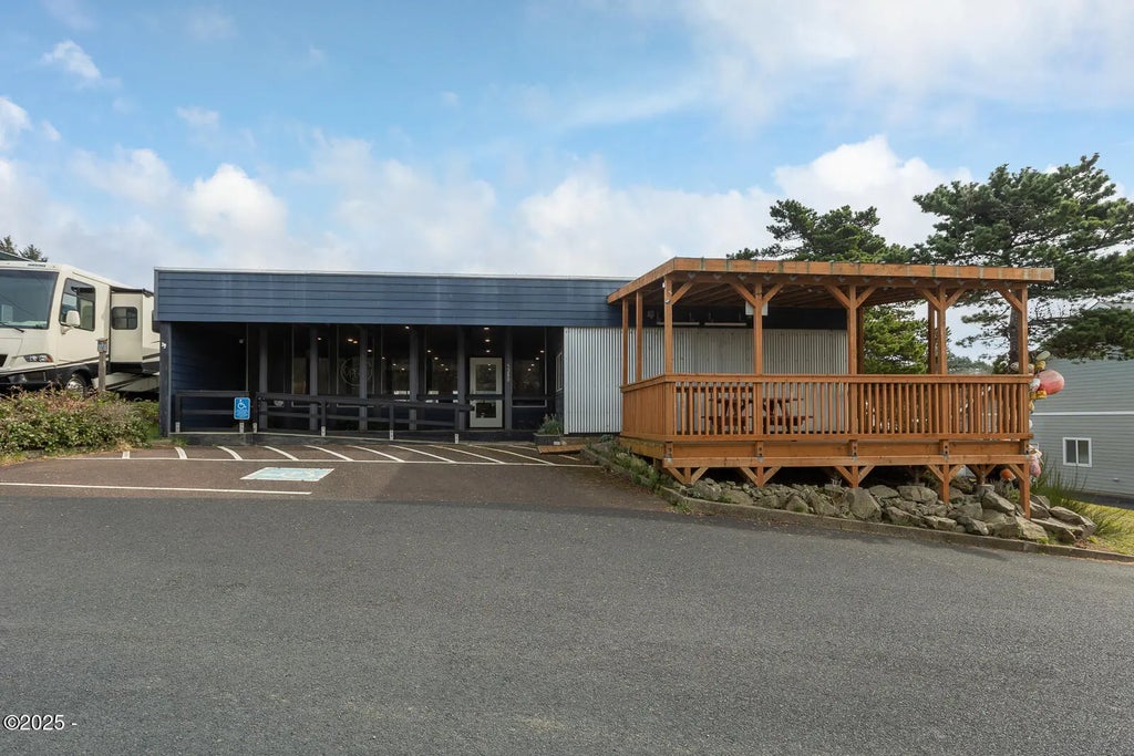 This commercial building located in Agate Beach in Newport offers flexibility of use with a wide-open floor plan. It is completely renovated with a Ductless heating system, LED lighting and updated plumbing and electric service. Convenient access from Hwy 101 at the Yaquina Lighthouse stop light offers ease for entering and exiting the highway. The property has Highway 101 frontage with white water ocean views and a large deck on the west side. There are 2 commercial garage doors with a loading dock, 2 ADA Bathrooms, a utility room, an office and 2 changing rooms. Parking includes 12 paved spaces and 6 additional parking spots including ADA. 3 Food Truck spaces have been approved by the city. There is a separate address and electrical service for the food trucks. Engineered plans to add units on top of the current building up to 50' height and blueprints for a commercial/residential unit next to the current building are both available. Buyers to complete their own due diligence for city approvals.