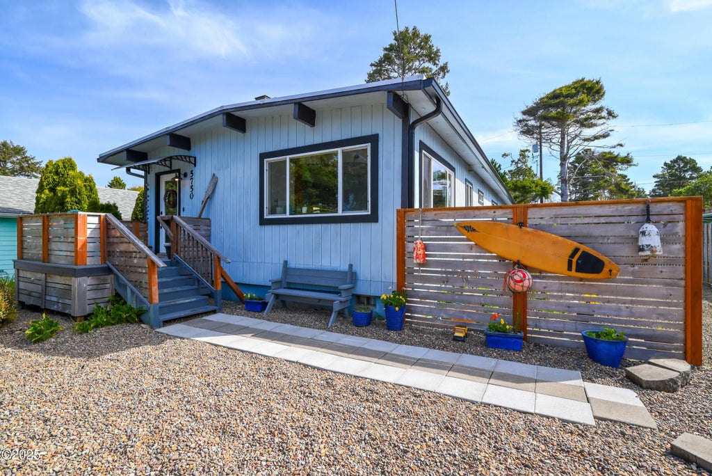 This renovated Mid Century charmer sits on a spacious, flat lot close to the beach. Located in the coveted Coronado Shores neighborhood, a walkable and bikable beachside community just south of Lincoln City with a seasonal outdoor pool, clubhouse, beachfront cabana, close beach access (4 minute walk) and fun community events! A few steps up to the front porch, leads you into the remodeled open concept living space that is filled with light from the large windows and features awesome vaulted wood & beam ceilings. Kitchen w/ quartz counters, white shaker cabinets, pantry w/ barndoor, and stainless steel appliances. Dining room w/ custom driftwood light fixture and big windows. Living room has a cozy gas fireplace w/ the original stone surround. Also on the main level is a large bedroom, 2nd bedroom and full bathroom w/ tub/shower combo. Access to the grass side yard, a deck and covered Hot Tub area. Downstairs spaces include a generous family room with a wood burning fireplace and a half bath & laundry. A Primary Bedroom Suite w/ a spacious sleeping space and a remodeled attached bathroom w/ walk in shower & large walk in closet. This home is perfect for full time, second home or multi generational living. Great separation and sleeping spaces up and down make a perfect beach home for your family! Large attached 2 car garage. Plenty of room for RV or toys parking. Recent renovations include: New Roof & gutters, some updated plumbing and electrical, new shiplap throughout upper level & New Minisplit Heat Pump.